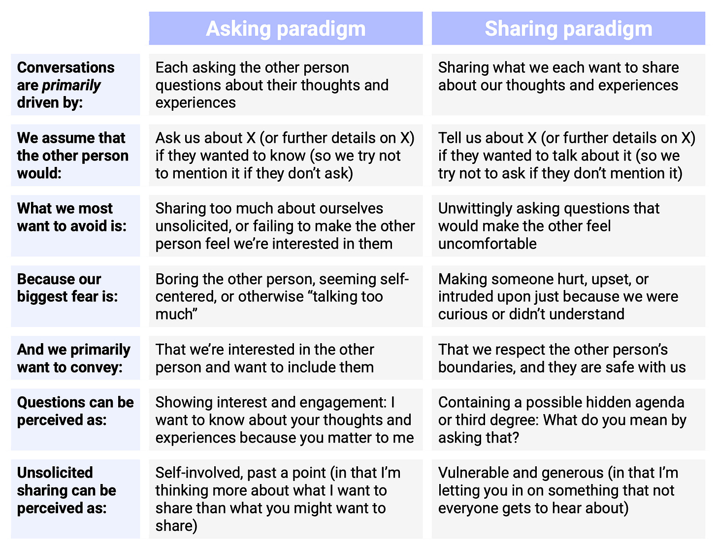 I started to try to name and describe what I was experiencing as the clash between “asking” and “sharing” paradigms. With significant others and close friends over the years, I would sometimes venture to suggest, cringingly, how I’d love for them to reciprocate when I ask them about their thoughts and feelings, or ask how a major event had gone when they saw me afterwards.