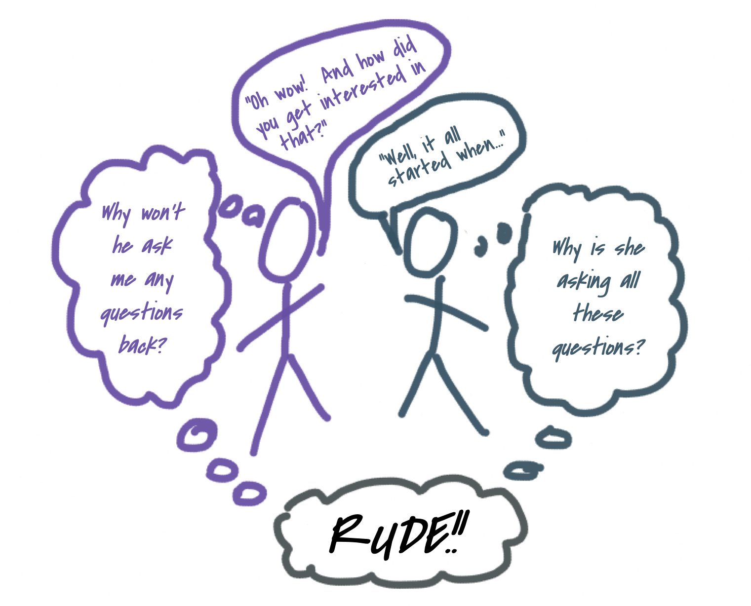 Or, Scenario Two: You’re trying to carry on a friendly conversation with someone, and sharing stories in order to build rapport. But as you open yourself up more to them, they do not seem to reciprocate! They keep you in the hot seat with question after question, until you start to feel uncomfortable. Why has this conversation turned into an interview? Why don’t they recognize the generosity of the effort you’re making to open up, and return the favor (so you at least know what’s okay to ask about)? Do they not feel comfortable around you?